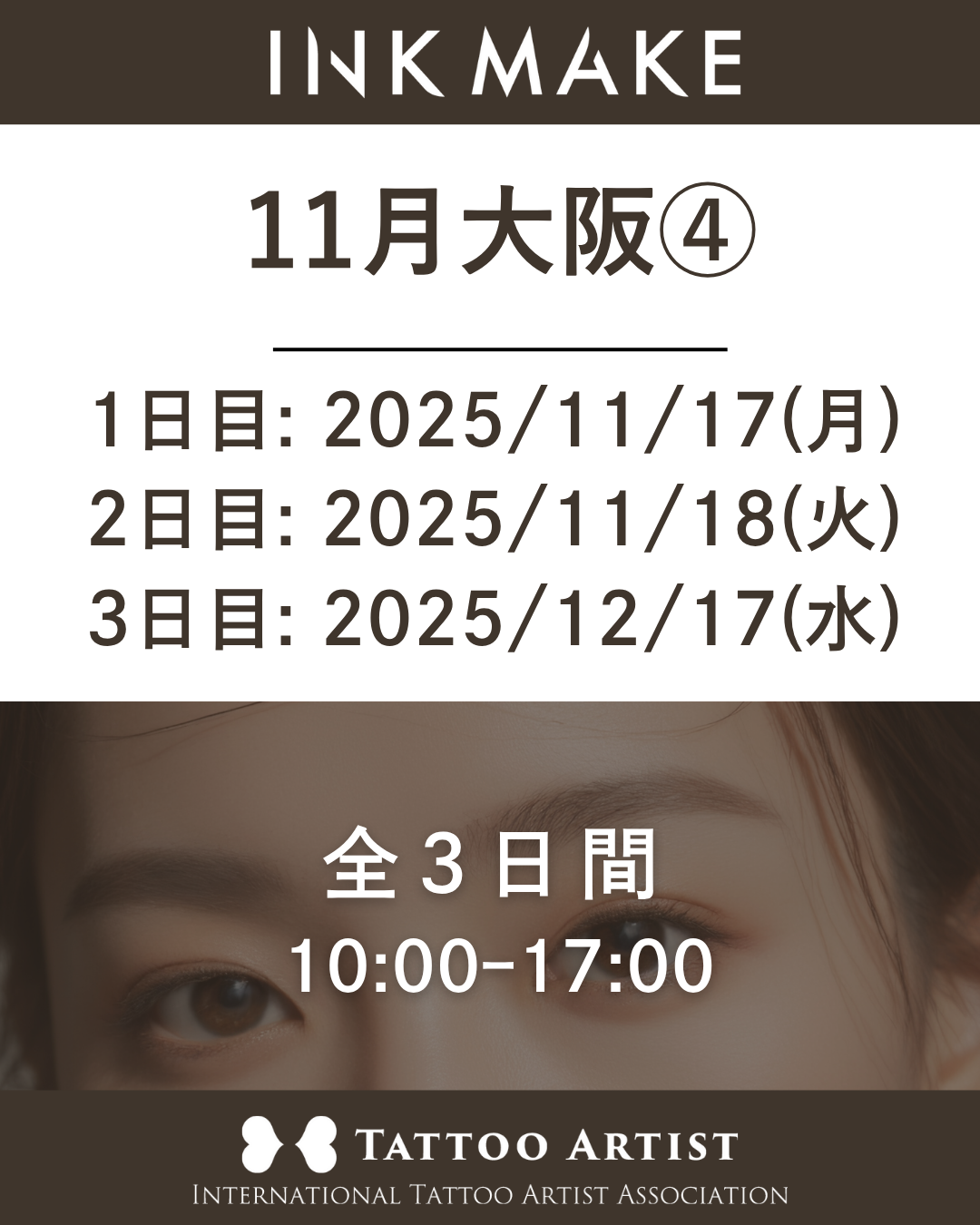 本プログラムでは、インクメイク施術で使用するマシン・インク等の技術とヘアメイク・メイクアップの技術を取り入れた最新のデザイン分析知見を用いて、インクメイク(タトゥーを使ったメイク)のサロン導入に向けた実践的な技術習得を目的とします。